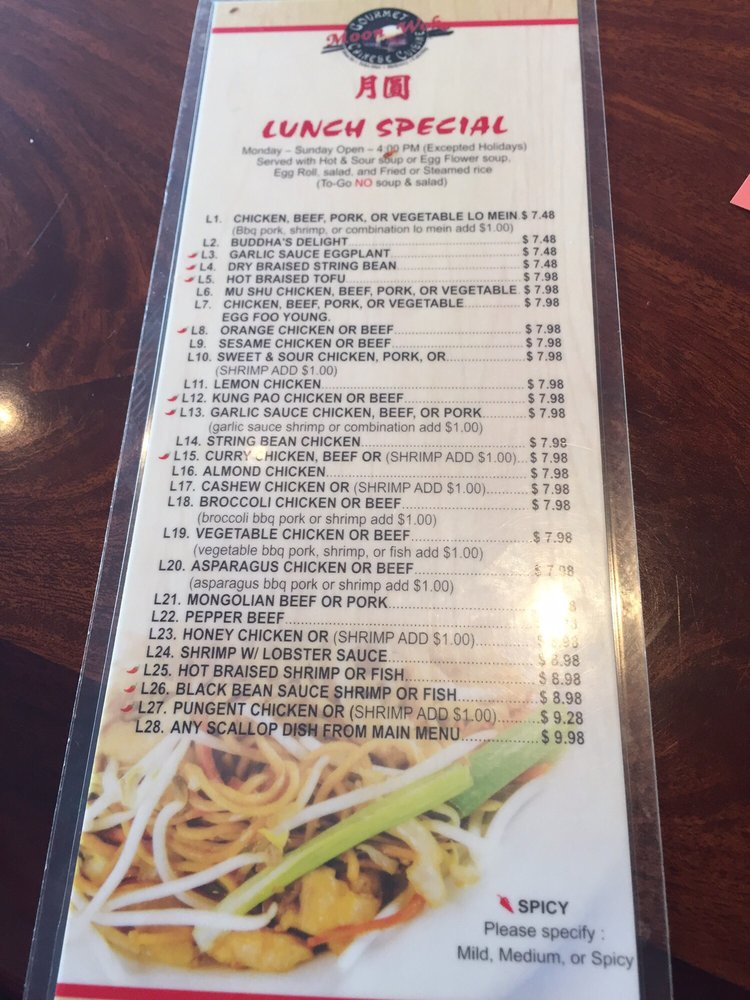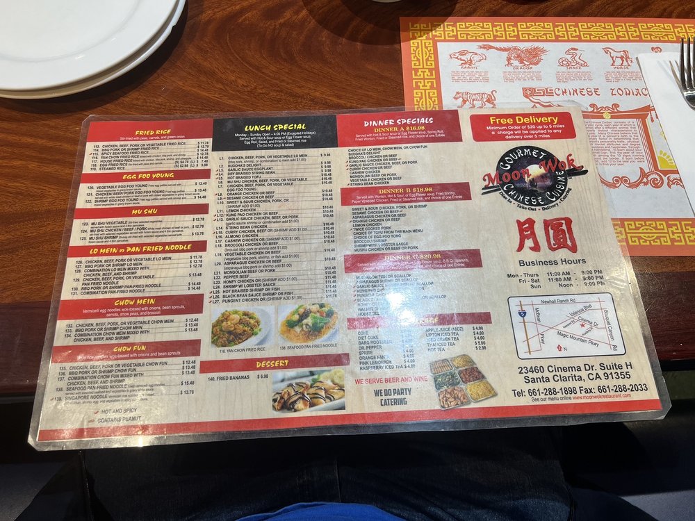 Introducing Moon Wok, a casual Chinese restaurant located in Santa Clarita, CA. This spot offers a variety of utilities such as reservation options, delivery, takeout, and catering services. With limited vegetarian choices, Moon Wok caters to a wide range of taste preferences. Customers rave about the flavorful dishes and generous portions, making it a go-to spot for lunch or dinner. The service may sometimes be a bit slow, but once you're settled, the attentive staff ensures a pleasant dining experience. From classic favorites to bold new flavors, Moon Wok consistently delivers top-notch Chinese cuisine. Whether you're in the mood for sweet and pungent chicken or walnut shrimp, this spot hits the spot every time. Don't miss out on their fried rice combos or combination chow mein for a satisfying meal that keeps you coming back for more.